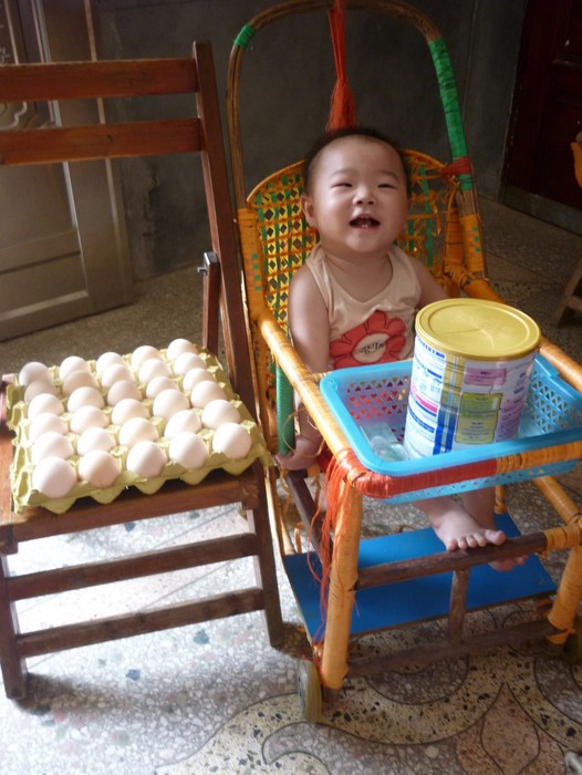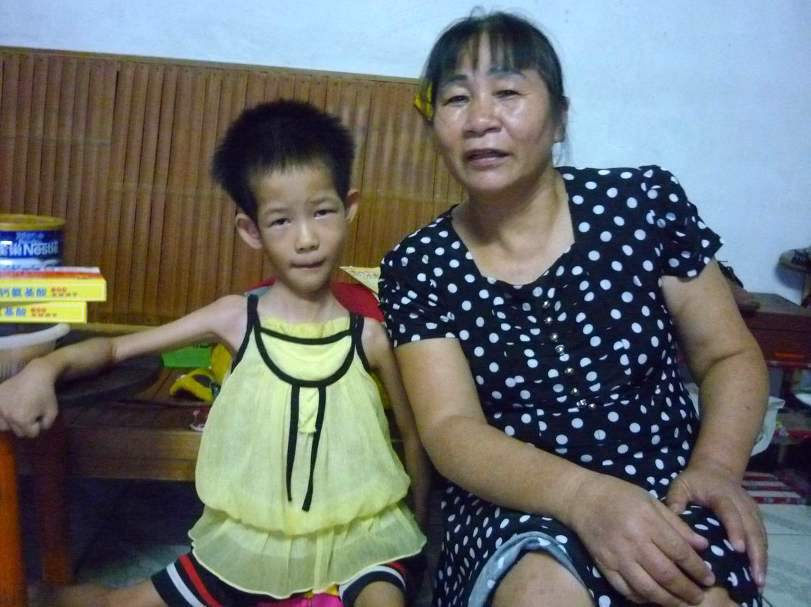 M. is three, and has rickets. At our last visit in July 2014, Meiquan weighed 11.7kg and was 94cm tall. At this visit, he was 12kg and 95cm. Every day, he has two servings of milk (each serving is 300ml). He also has half of a supplement tablet every day. Every day he has one egg and he eats a bowl of rice with every meal. He also eats vegetables, all kinds of soups, and meat.